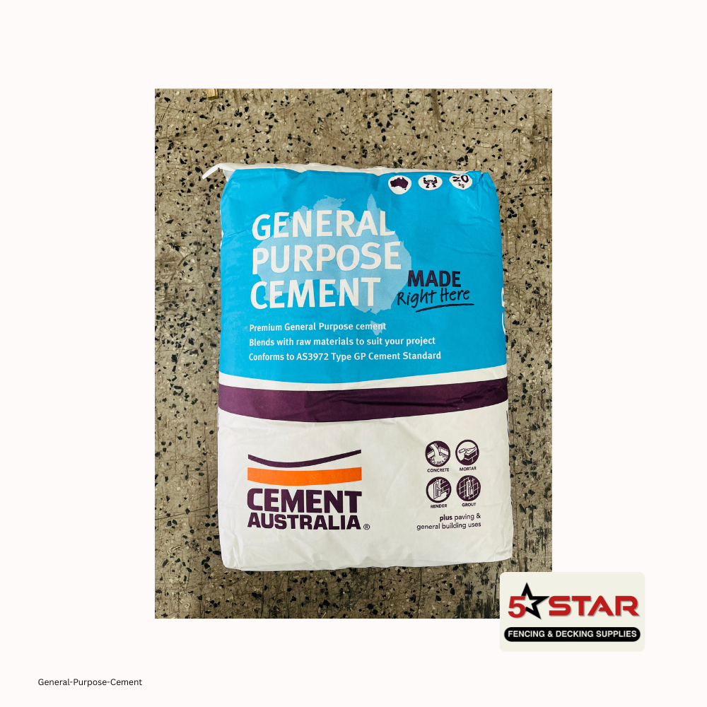 Ultimate general purpose cement for concrete, mortar, rendering, and more. Sold by 5 Star Fencing & Decking Supplies, this 20kg bag is certified to AS3972 standards and blends easily for any building project.